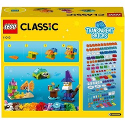 El set de construcción LEGO® Classic Ladrillos Creativos Transparentes (11013) contiene una deslumbrante gama de piezas LEGO transparentes de toda clase de colores, formas y tamaños, así como una fantástica selección de piezas, ojos, ruedas y ladrillos LEGO clásicos: todo lo que un niño necesita para entregarse al juego creativo durante horas sin fin.