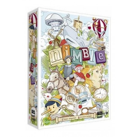 Tienda Diverti Es divertido leer? En este dinámico juego de reacción todos los jugadores juegan sus cartas a la vez. Muévete rápidamente a través de 6 clásicos de la literatura. Alicia, Don Quijote y compañía nunca antes habían sido tan frenéticos La primera vez que vi este juego me llamaron la atención las ilustraciones de la caja, Pinocho, Alicia en el País de las Maravillas, Don Quijote, entonces pensé que sería un juego de contar historias o algo parecido, pero nada más lejos de eso, Nimble, como su nombre bien lo indica es un juego de agilidad y rapidez visual. Nimble es un juego pensado para niños a partir de 6 años y para adultos de cualquier edad ¿Porqué digo esto? Lo hemos jugado en casa adultos (algunos no tanto) y nos hemos divertido mucho, sobre todo resolviendo el juego y comprobando que nadie se había equivocado…. El objetivo del juego es muy sencillo, ser el primer jugador en quedarse sin cartas, pero antes de explicar la mecánica veamos los componentes: 120 cartas que se agrupan en 4 mazos de 30 cartas cada uno.