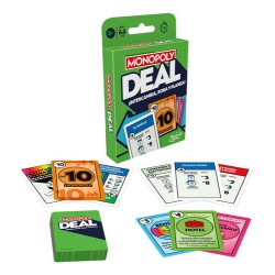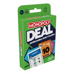 ¡Intercambia, roba y planea con el juego de cartas Monopoly Deal! Sé el primer jugador en reunir 3 grupos completos de cartas de propiedad, cada uno de un color diferente, para ganar. Este mazo incluye 110 cartas: cartas de propiedad, cartas de comodín de propiedad, cartas de acción y cartas de dinero. Las cartas de comodín de propiedad ayudan a los jugadores a armar grupos de propiedades. Las cartas de acción cambian el juego permitiendo a los jugadores cobrar la renta, robar e intercambiar propiedades y mucho más. Y los jugadores pagan sus deudas con cartas de dinero. Este juego se prepara y se juega fácilmente en apenas 15 minutos. Edad recomendada: A partir de 8 años. Si buscas divertidos juegos familiares o juegos de viaje para niños y adultos, este juego es una excelente opción.