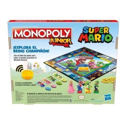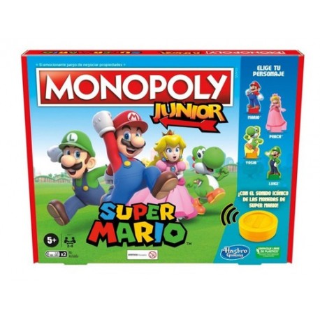 Tienda Diverti Marca: Hasbro El juego Monopoly Junior se une con los personajes y temas de Super Mario para hacer un emocionante juego infantil. En el juego de mesa Monopoly Junior: Super Mario, los jugadores pueden imaginar que recorren el Reino Champiñón como Mario, Peach, Yoshi o Luigi, comprando propiedades y recolectando monedas. Los jugadores tiran el dado de poder para saber si pueden presionar la Moneda Sonora, que reproduce el sonido de moneda de Super Mario, y recolectar monedas. Este divertido juego es ideal como regalo de cumpleaños o de Navidad para fans de Super Mario y niños partir de 5 años.